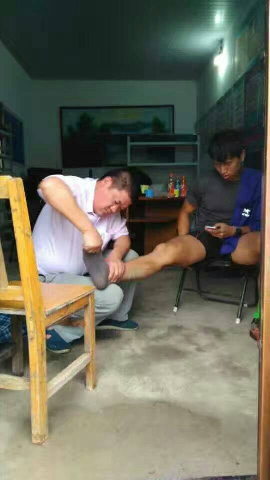其中一位来自福建的跑友在挑战中不小心扭伤了脚,无法行进。一名志愿者发现后第一时间联系队长,通过当地村干部的引导下找到当地的一名医生,在救助的过程中才发现原来是脚踝脱臼,辛亏及时发现及时得到救助,不然给运动员造成更大的伤害和痛苦……